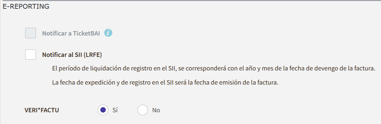 • Notificar a TicketBAI (Norma Foral 13/2021, de 21 de abril (Álava). Norma Foral 3/2020, de 6 de noviembre (Guipúzcoa), Norma Foral 8/2023, de 22 de noviembre (Vizcaya))