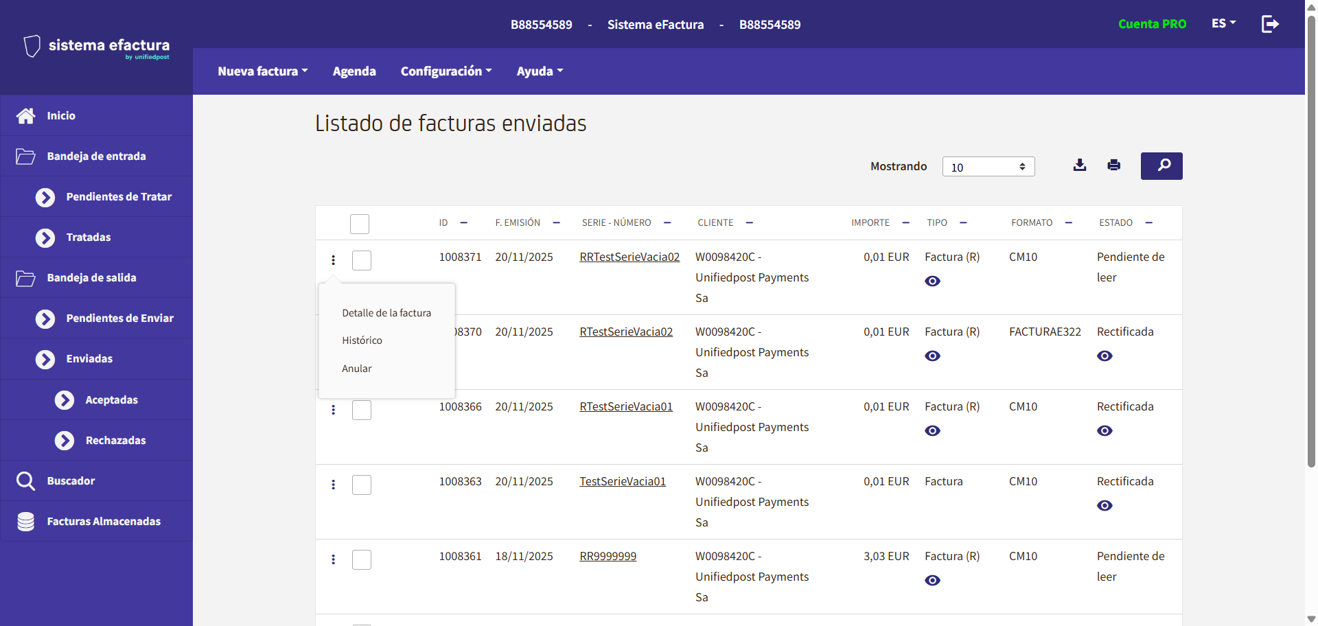 En esta opción puede ver el detalle de la factura y consultar el histórico. Además de estas opciones, en esta ventana se pueden realizar otras operaciones: