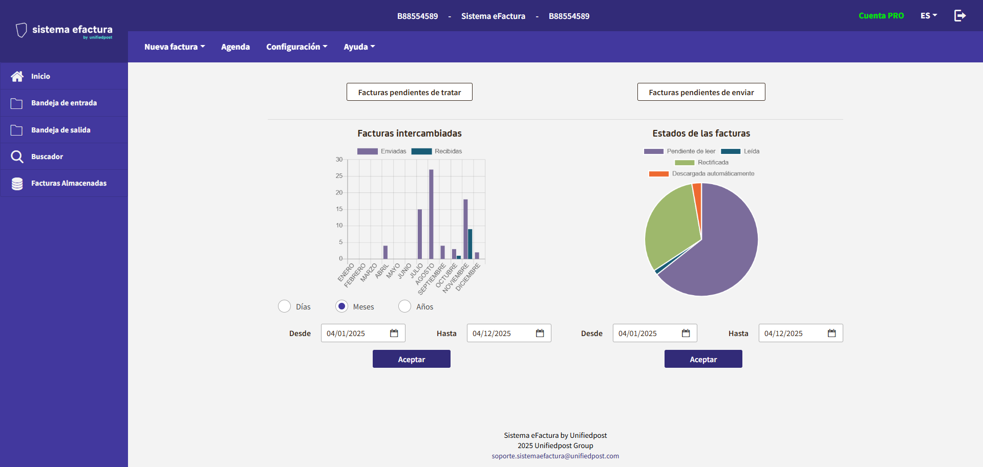 Cuando se accede al servicio, la primera pantalla será la de "Inicio", en la pantalla se indica un resumen, en forma de gráficos, de las facturas procesadas y sus estados: